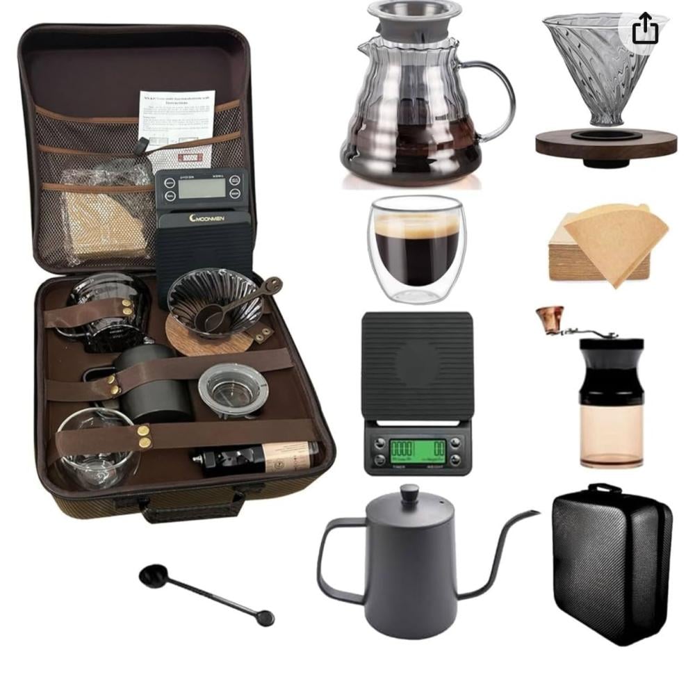 - مجموعة تحضير القهوة V60، يمكنك الحصول على وعاء قهوة مُخمر يدويًا ومطحنة قهوة ووعاء لمشاركة القهوة وكوب فلتر وكوب قهوة وملعقة قهوة ومقياس إلكتروني توقيت وورق فلتر، لن تحتاج إلى شراء أي شيء آخر،